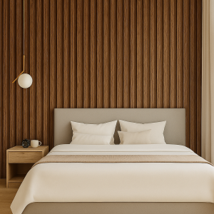 W sypialni warto postawić na ciepło i naturalność, dlatego lamele w kolorze Dąb Ciemny to doskonały wybór za wezgłowie łóżka. Widoczna struktura słojów oraz głęboki, brązowy odcień tworzą przytulne, spokojne tło, które wprowadza do wnętrza domowy, harmonijny klimat. Lamele w takim wykończeniu pięknie kontrastują z jasnymi tekstyliami i meblami, dodając pomieszczeniu elegancji i stylu bez przesadnego przepychu.