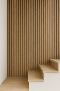 Ściana przy schodach z lamelami w kolorze Dąb Jasny