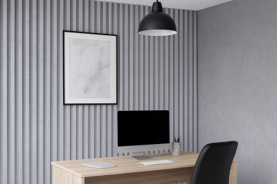 W domowym biurze świetnie sprawdzają się lamele w kolorze Szary Brokat. Jasnoszara struktura z subtelnym, perłowym połyskiem nadaje przestrzeni nowoczesnego, lekkiego charakteru, a zarazem podkreśla profesjonalny styl pomieszczenia. Jasny kolor doskonale komponuje się z jasnym drewnem, czernią oraz bielą, dzięki czemu łatwo wpasowuje się w nowoczesne aranżacje. Lamele w tej wersji tworzą wyraźną, ale nienachalną strukturę ściany – taką, która przyciąga wzrok, ale nie dominuje nad resztą wystroju.