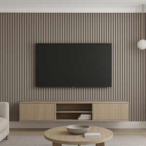 W salonie warto postawić na mocny, nowoczesny akcent. Lamele Coffee Brokat świetnie sprawdzą się na ścianie telewizyjnej, tworząc eleganczne tło dla ekranu i mebli RTV. Ich wyrazista faktura i głęboki kolor podkreślają nowoczesny, lekko luksusowy styl wnętrza. Dzięki temu strefa wypoczynkowa zyskuje nie tylko estetyczną ramę, ale też wyjątkowy charakter – spójny z resztą aranżacji.