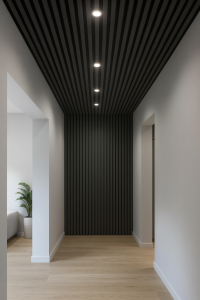 W korytarzu, szczególnie o większej wysokości, efektownie prezentują się lamele Grafit zamontowane na suficie i ścianie. Ciemna tonacja oraz rytmiczny układ pionowych pasów dodają wnętrzu głębi i elegancji. Grafit idealnie pasuje do jasnych ścian i naturalnych podłóg – tworząc nowoczesny kontrast, który nadaje przestrzeni wyjątkowy charakter. To doskonałe rozwiązanie, jeśli chcesz wyróżnić wejście do domu lub strefę przejściową bez zbędnych dodatków.
