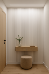 Przedpokój z lamelami Satyna Biały nabiera wyjątkowej świeżości i subtelności. Jasna, satynowa powierzchnia lameli odbija światło, optycznie powiększając przestrzeń i sprawiając, że wnętrze staje się jaśniejsze i bardziej przyjazne. Takie wykończenie dobrze komponuje się z jasnym drewnem i beżowymi dodatkami, a całość tworzy eleganckie, minimalistyczne wejście do mieszkania lub domu. To doskonała propozycja dla miłośników klasycznej bieli w nowoczesnym wydaniu.