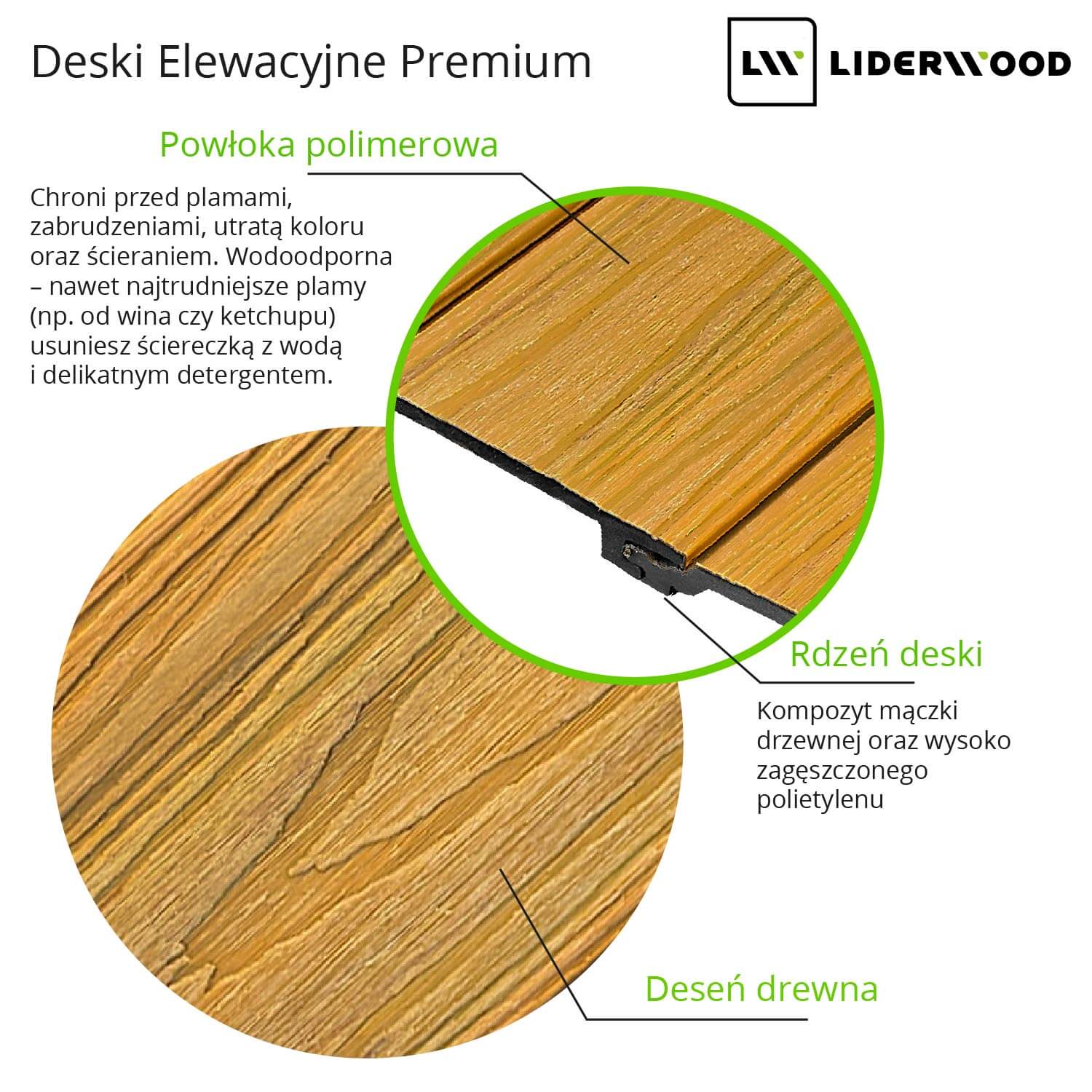 Deska elewacyjna Premium to praktyczne i efektowne rozwiązanie, które łączy wygląd naturalnego drewna z wytrzymałością nowoczesnych materiałów kompozytowych. Dzięki tłoczonemu w wysokiej temperaturze deseniowi drewna i zewnętrznej powłoce polimerowej, deski są odporne na blaknięcie koloru, zabrudzenia i działanie warunków atmosferycznych.