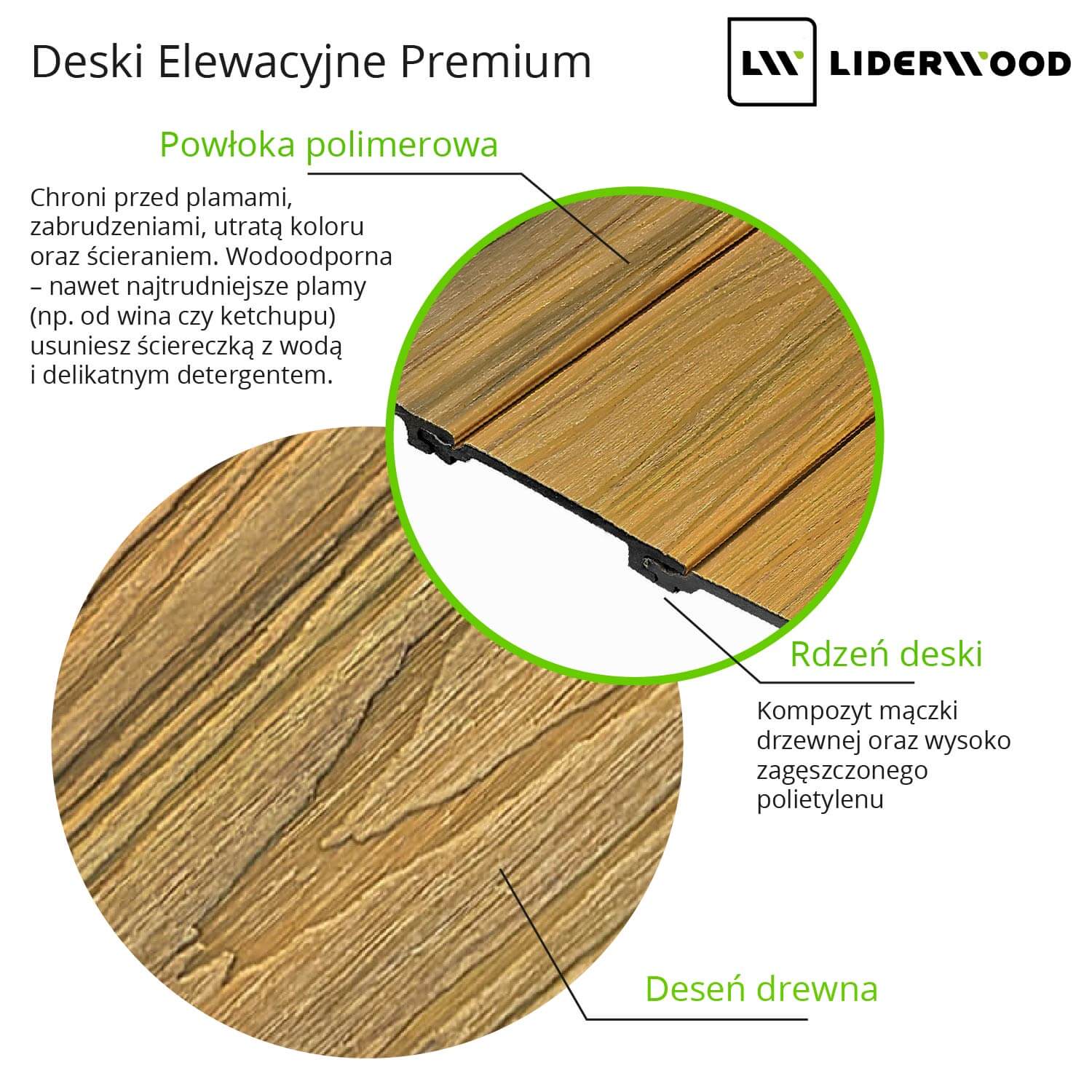 Deska elewacyjna Premium to praktyczne i efektowne rozwiązanie, które łączy wygląd naturalnego drewna z wytrzymałością nowoczesnych materiałów kompozytowych. Dzięki tłoczonemu w wysokiej temperaturze deseniowi drewna i zewnętrznej powłoce polimerowej, deski są odporne na blaknięcie koloru, zabrudzenia i działanie warunków atmosferycznych.