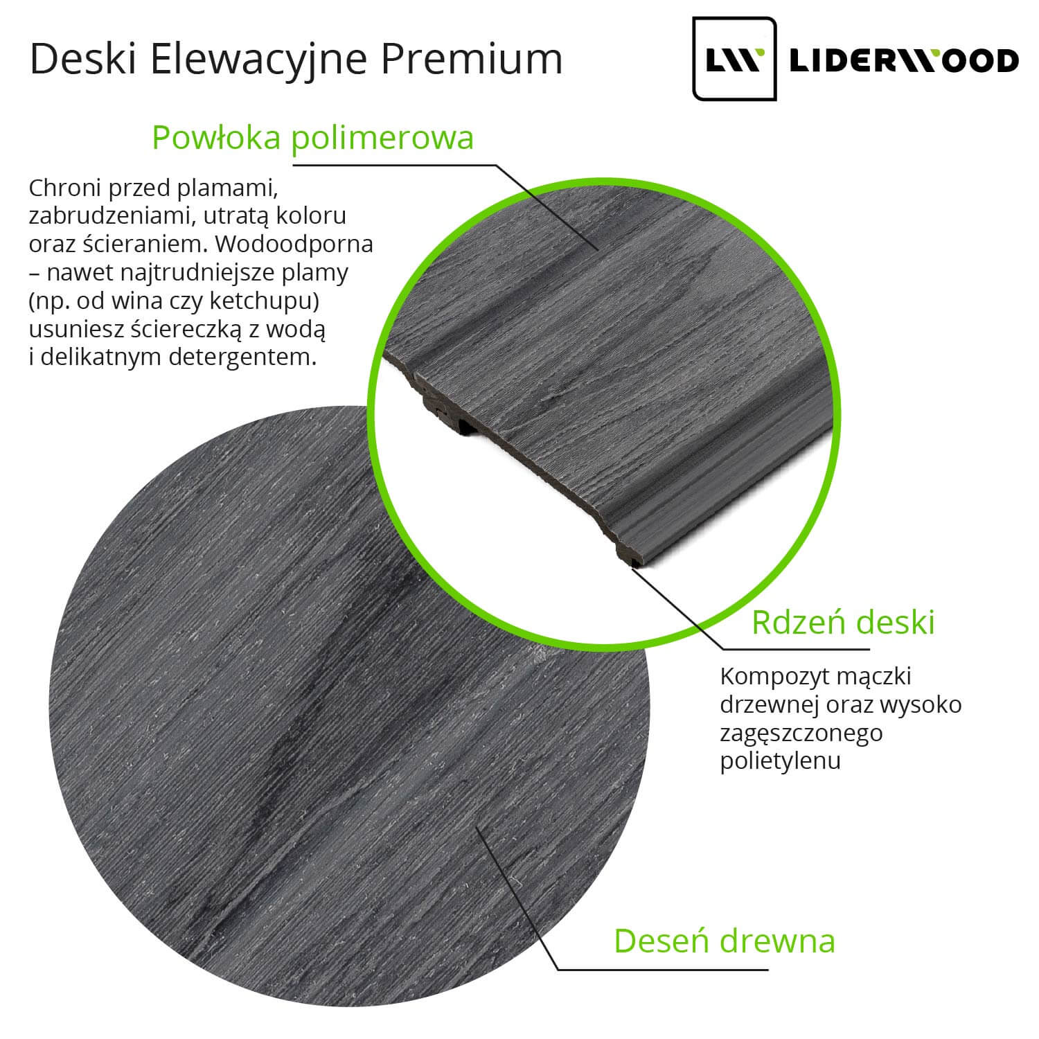 Deska elewacyjna Premium to praktyczne i efektowne rozwiązanie, które łączy wygląd naturalnego drewna z wytrzymałością nowoczesnych materiałów kompozytowych. Dzięki tłoczonemu w wysokiej temperaturze deseniowi drewna i zewnętrznej powłoce polimerowej, deski są odporne na blaknięcie koloru, zabrudzenia i działanie warunków atmosferycznych.
