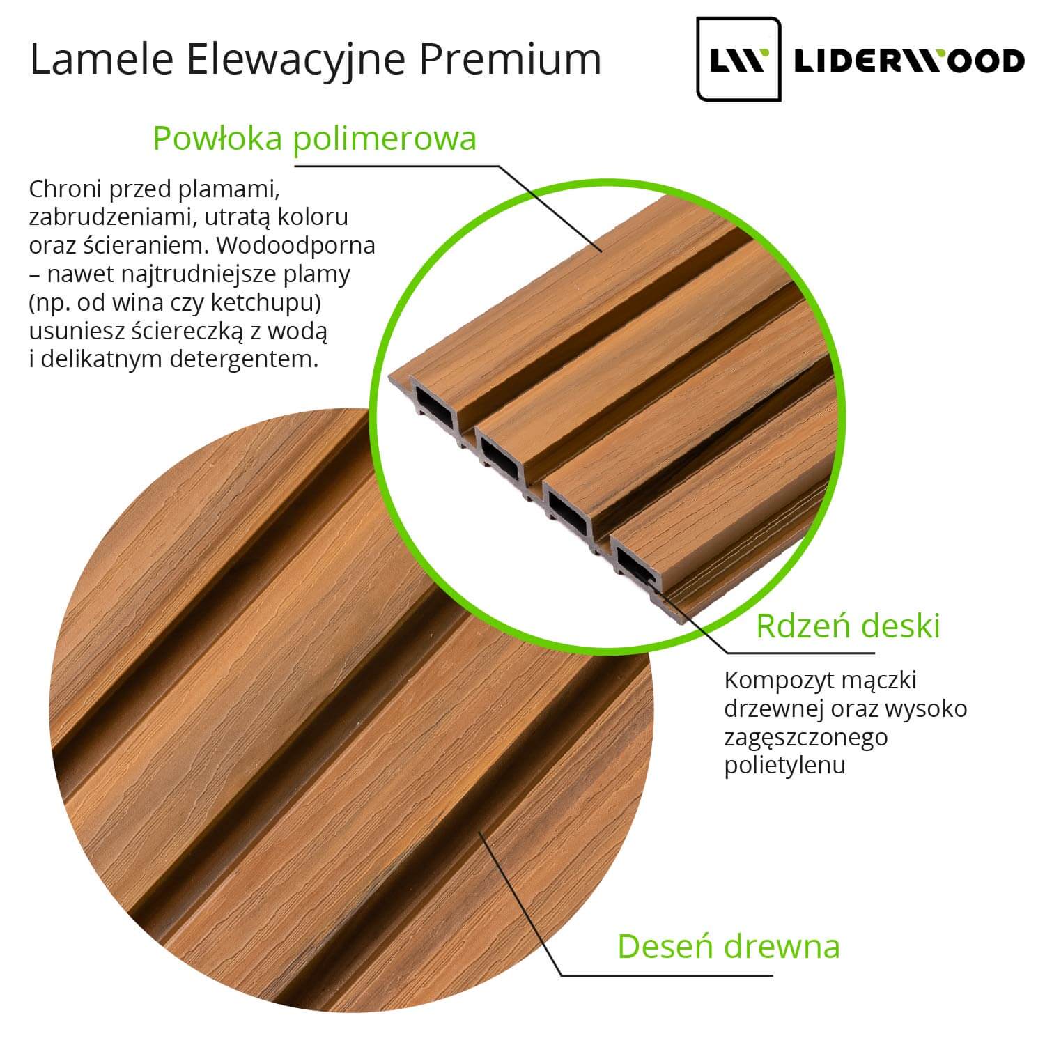 Lamele wykonane są z wytrzymałego kompozytu mączki drzewnej i polietylenu wysokiej gęstości, a ich powierzchnia zabezpieczona jest powłoką polimerową – warstwą chroniącą przed ścieraniem, plamami i wilgocią. Panele są łatwe w czyszczeniu i nie wymagają żadnej konserwacji ani olejowania.