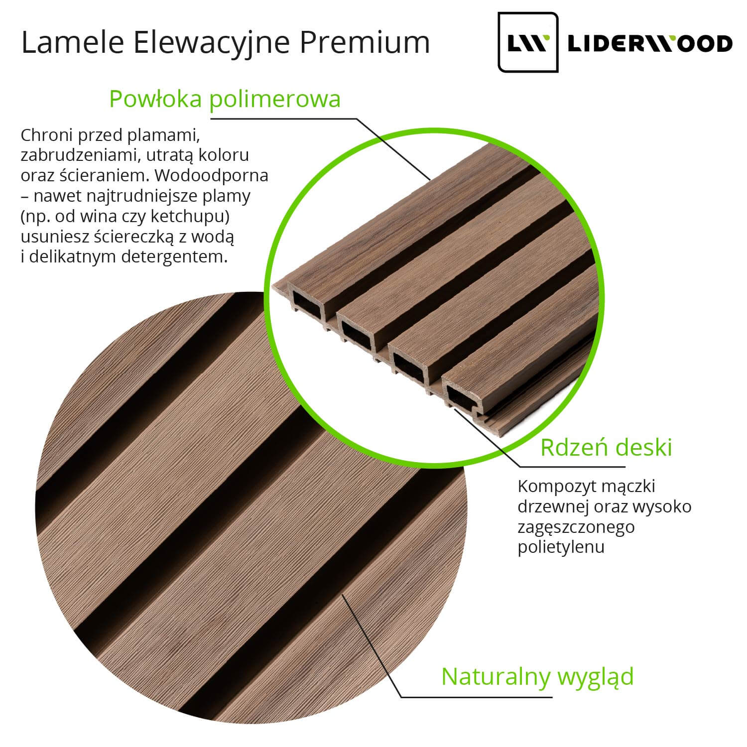 Specjalna konstrukcja paneli kompozytowych lamelowych gwarantuje ich sztywność i trwałość, a ich montaż na pióro-wpust jest szybki, estetyczny i precyzyjny, co gwarantuje efektowny wygląd od pierwszego dnia.