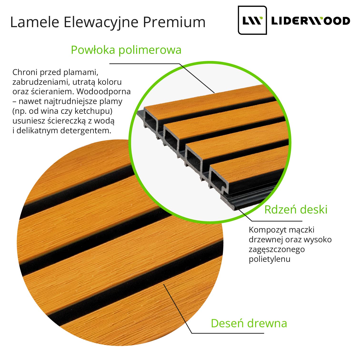 Lamele wykonane są z wytrzymałego kompozytu mączki drzewnej i polietylenu wysokiej gęstości, a ich powierzchnia zabezpieczona jest powłoką polimerową – warstwą ochronną, która chroni przed ścieraniem, plamami i blaknięciem koloru. Panele są łatwe w czyszczeniu i nie wymagają żadnej konserwacji ani olejowania.