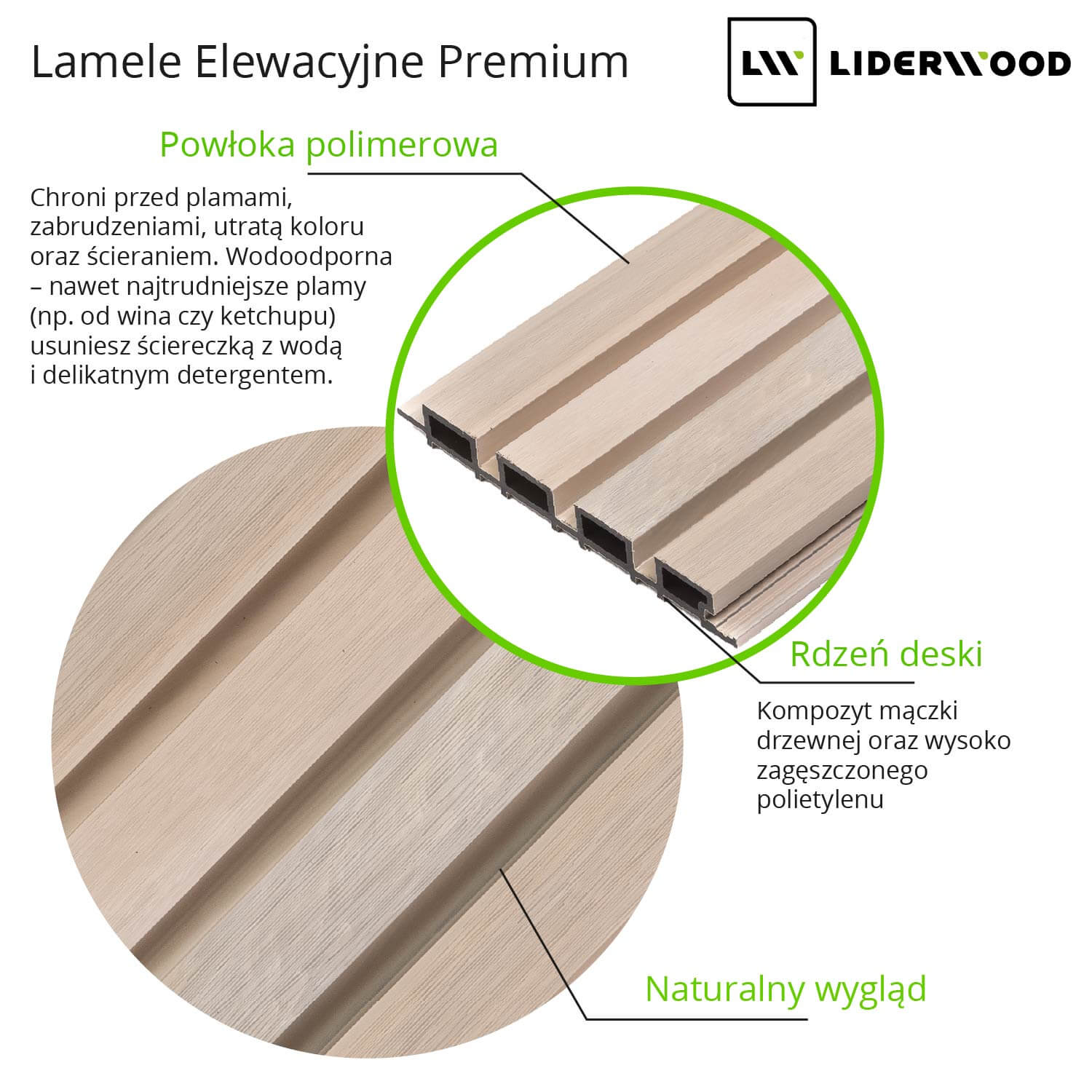 Lamele wykonane są z wytrzymałego kompozytu mączki drzewnej i polietylenu wysokiej gęstości, a ich powierzchnia zabezpieczona jest powłoką polimerową – warstwą ochronną, która chroni przed ścieraniem, plamami i blaknięciem koloru. Panele są łatwe w czyszczeniu i nie wymagają żadnej konserwacji ani olejowania.