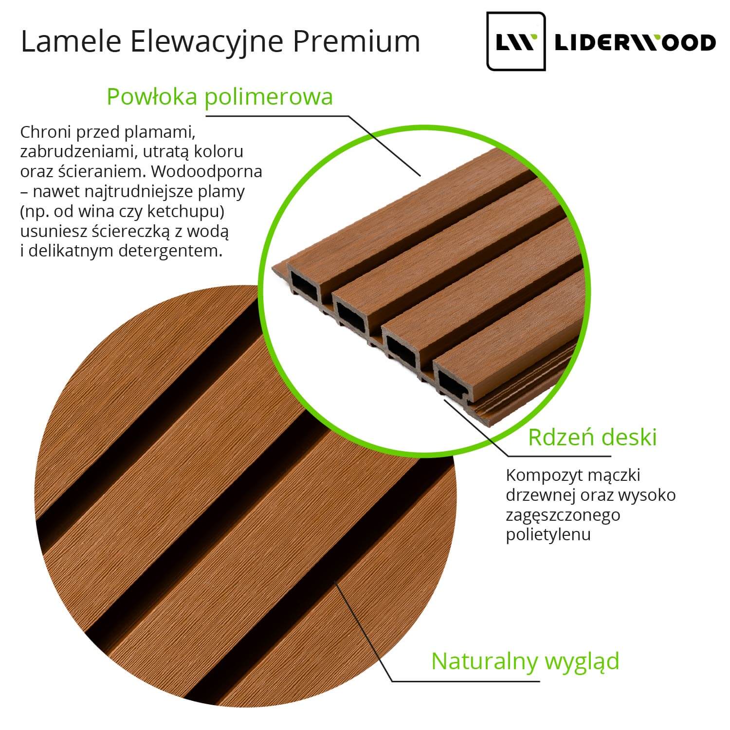 Specjalna konstrukcja paneli kompozytowych lamelowych gwarantuje ich sztywność i trwałość, a ich montaż na pióro-wpust jest szybki, estetyczny i precyzyjny, co gwarantuje efektowny wygląd od pierwszego dnia.
