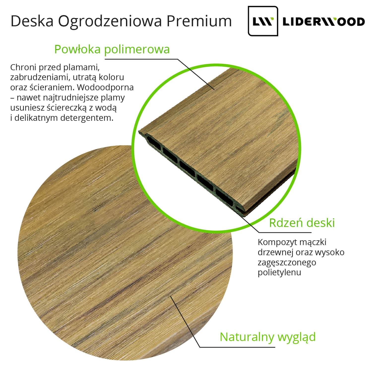 Powierzchnia deski pokryta jest ochronną powłoką polimerową, która skutecznie zabezpiecza przed blaknięciem, plamami i zabrudzeniami. Struktura imitująca naturalne drewno nadaje ogrodzeniu elegancki i ponadczasowy wygląd.