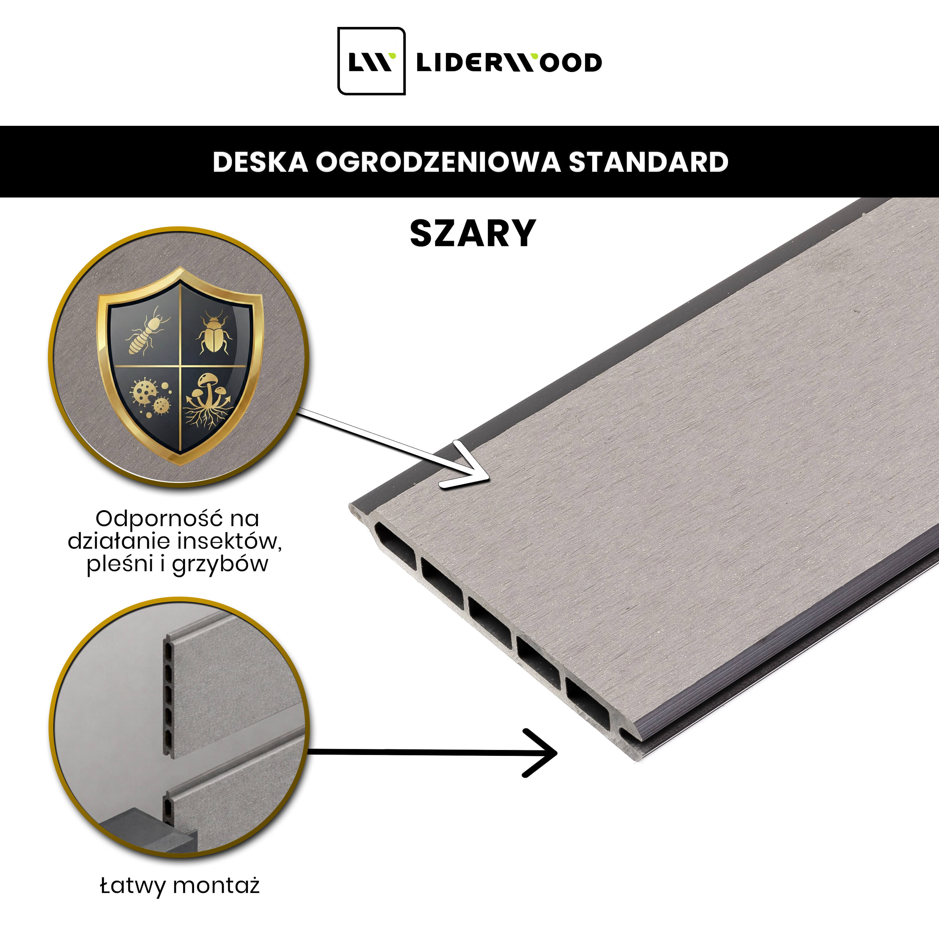 Deska Ogrodzeniowa Standard to praktyczne i ekonomiczne rozwiązanie do budowy solidnych ogrodzeń oraz nowoczesnych pergoli. Stanowi świetną alternatywę dla naturalnego drewna, oferując jego estetykę, a jednocześnie eliminując problemy związane z konserwacją, impregnacją i trwałością.ów pogodowych.
