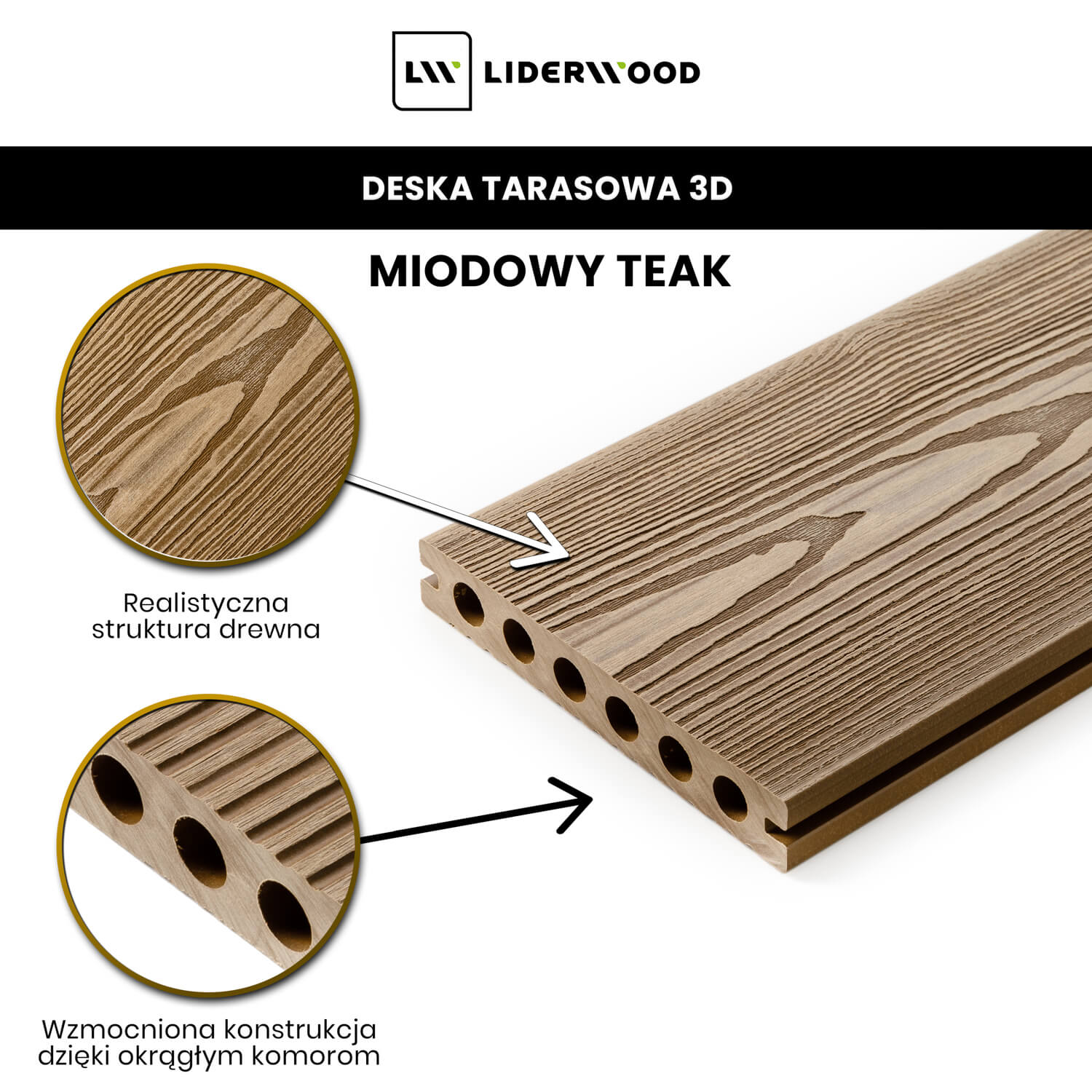 Deska 3D to połączenie eleganckiego wyglądu z praktycznym podejściem do aranżacji tarasu. Dzięki dwustronnemu wykończeniu możesz dopasować jej wygląd do własnych preferencji – wybierając między naturalnym tłoczeniem a subtelnym ryflowaniem. Wzmocniona konstrukcja i wysokiej jakości kompozyt sprawiają, że deska jest odporna na wilgoć, gnicie, promieniowanie UV i działanie insektów.