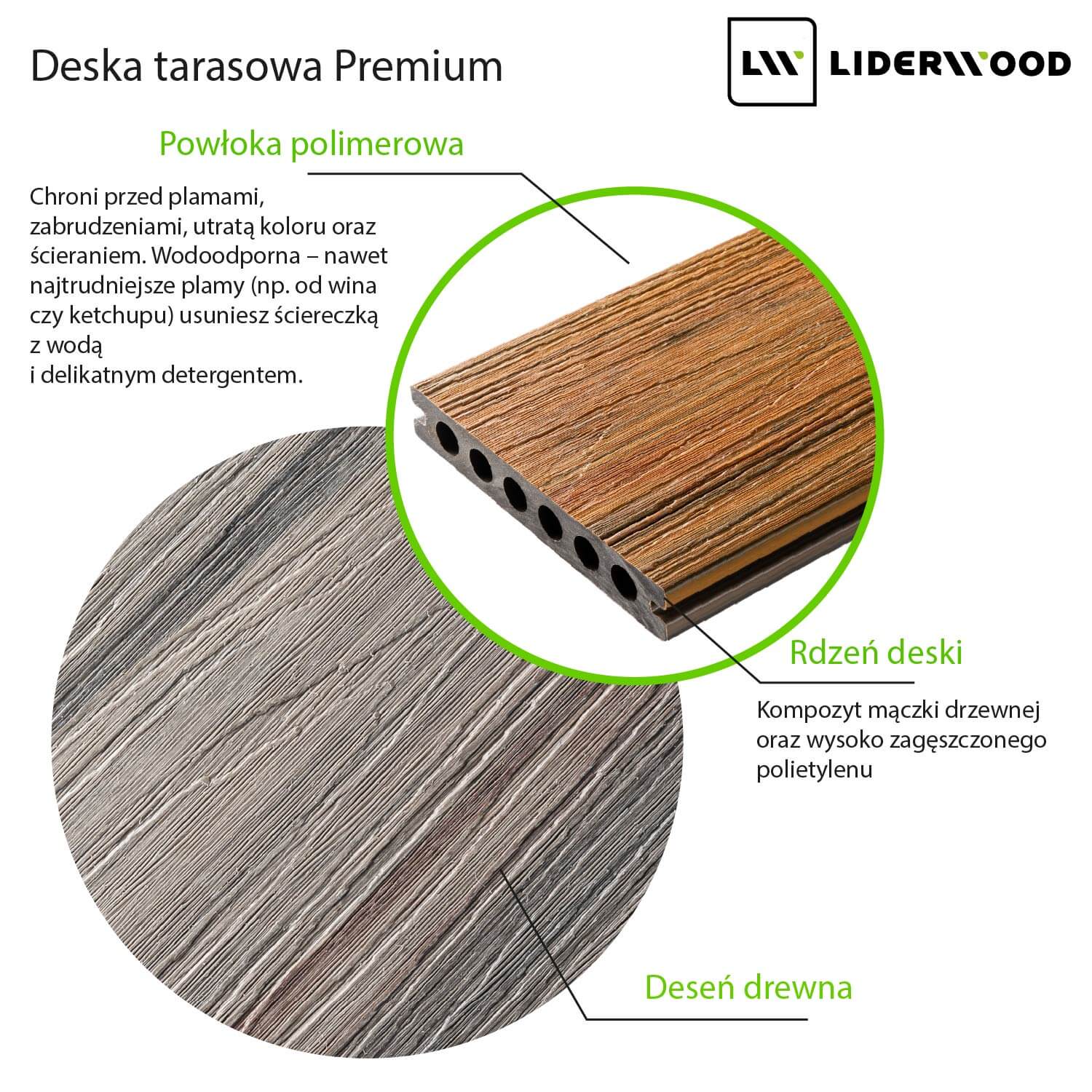 Deska Kompozytowa Premium II generacji to produkt, który łączy w sobie wyjątkową jakość z nowoczesnym designem. Dzięki zaawansowanej technologii produkcji deska ma charakterystyczną strukturę naturalnego usłojenia drewna. Deski tarasowe Premium są dwustronne i dwukolorowe – każda strona różni się odcieniem.