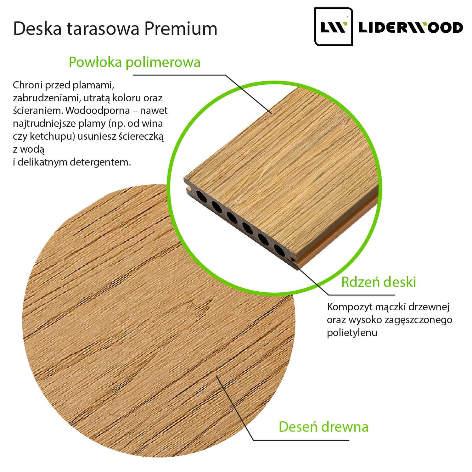 Deska Kompozytowa Premium II generacji to produkt, który łączy w sobie wyjątkową jakość z nowoczesnym designem. Dzięki zaawansowanej technologii produkcji deska ma charakterystyczną strukturę naturalnego usłojenia drewna. Deski tarasowe Premium są dwustronne i dwukolorowe – każda strona różni się odcieniem.