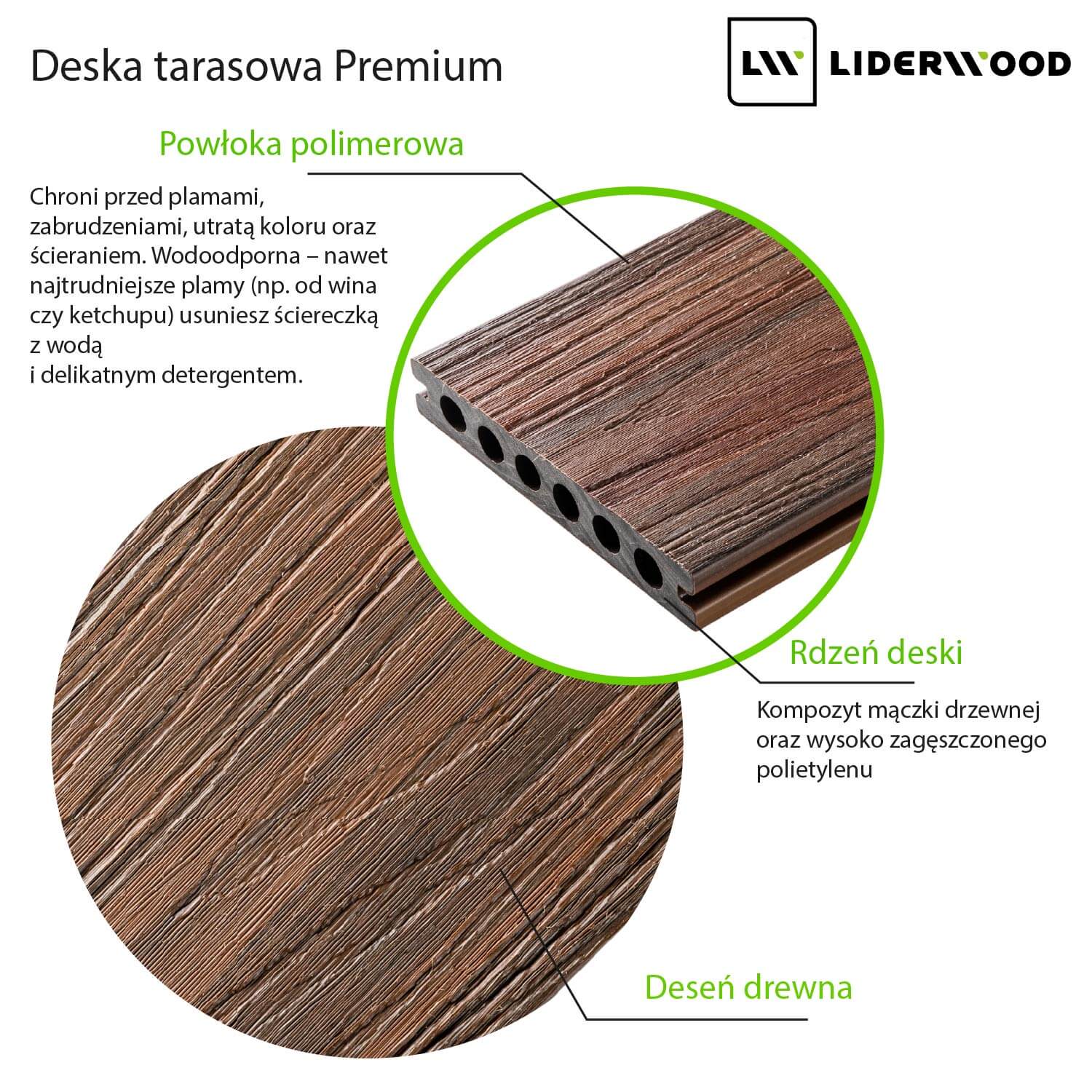 Deska Kompozytowa Premium II generacji to produkt, który łączy w sobie wyjątkową jakość z nowoczesnym designem. Dzięki zaawansowanej technologii produkcji deska ma charakterystyczną strukturę naturalnego usłojenia drewna. Deski tarasowe Premium są dwustronne i dwukolorowe – każda strona różni się odcieniem.