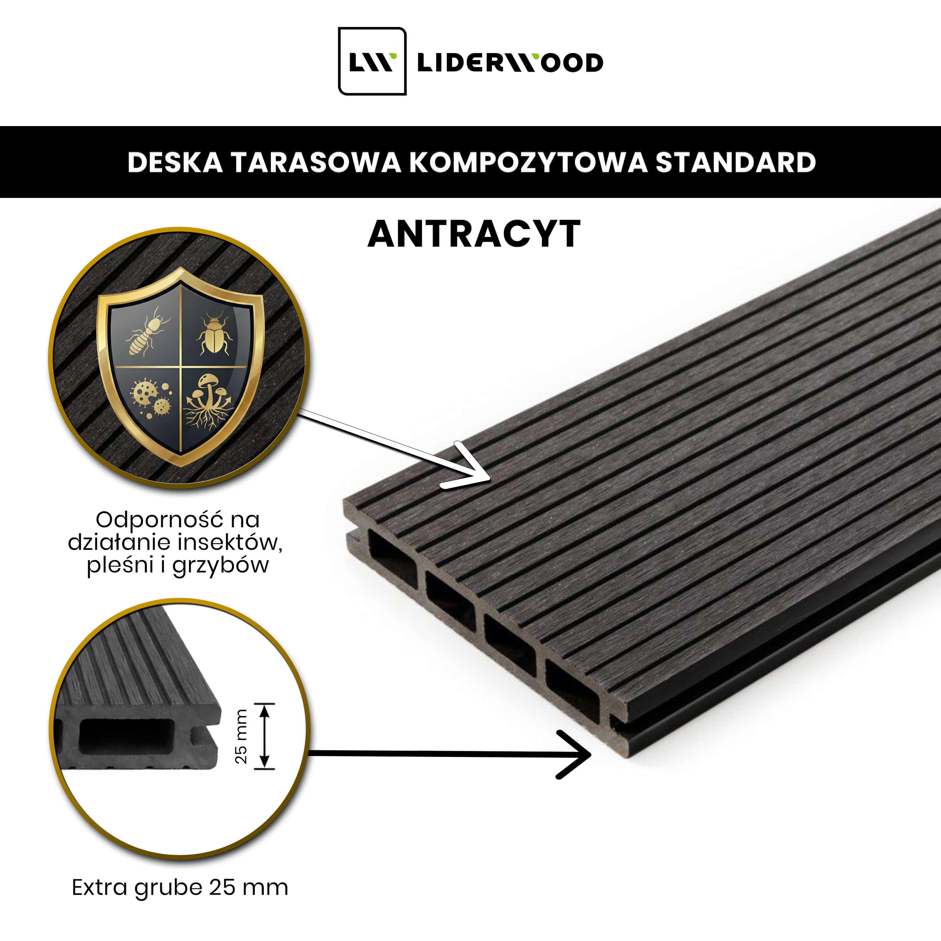Wykonana z wysokiej jakości kompozytu, deska tarasowa Standard łączy w sobie estetykę z funkcjonalnością. Oferuje także trwałość i odporność na niekorzystne czynniki atmosferyczne oraz zapewnia długotrwałe i bezproblemowe użytkowanie. Deska Standard to rozwiązanie zarówno do przydomowych tarasów, jak i dużych inwestycji. Jej ryflowana powierzchnia poprawia przyczepność, a uniwersalny design doskonale komponuje się z nowoczesną i klasyczną architekturą.