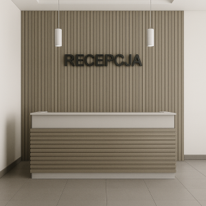 Ta wizualizacja przedstawia elegancką i nowoczesną recepcję, w której główną rolę odgrywają lamele dekoracyjne w kolorze Dąb Sonoma. Efekt? Wnętrze zyskuje lekkość, świeżość i profesjonalny charakter. Poziome ułożenie lameli na froncie lady recepcyjnej harmonijnie łączy się z pionowymi lamelami na ścianie, tworząc spójną, estetyczną kompozycję. To idealne rozwiązanie do miejsc, które chcą zrobić dobre pierwsze wrażenie – biur, gabinetów, hoteli czy klinik, gdzie liczy się zarówno funkcjonalność, jak i stylowy wygląd przestrzeni.