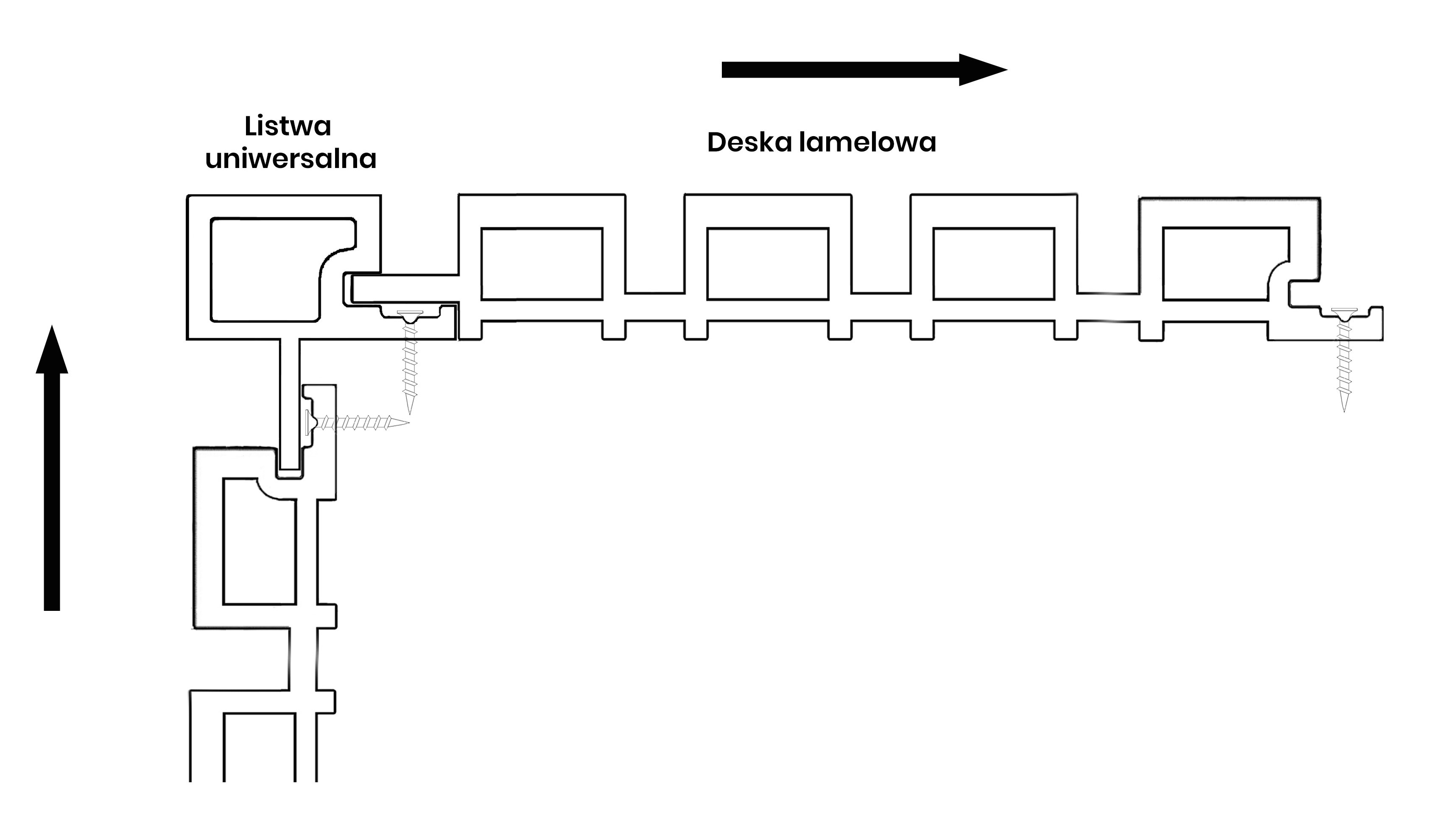 Listwa uniwersalna z jednej strony jest zakończona wpustem, z drugiej – piórem. Dzięki temu może służyć jako listwa narożna lub startowo-zakończeniowa. Montujemy ją do legarów za pomocą wkrętów w taki sam sposób, jak deski lamelowe.