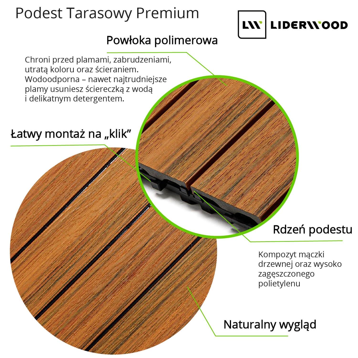 Podesty kompozytowe Premium II generacji wyróżniają się wyjątkową jakością wykonania. Nie tylko naturalnie wyglądają jak drewno, ale są również solidne i trwałe. Powierzchnia z ochronną warstwą polimerową zabezpiecza podesty przed zabrudzeniami, plamami i ścieraniem. Nie musisz ich impregnować co roku – wystarczy standardowa pielęgnacja i utrzymanie ich w czystości.