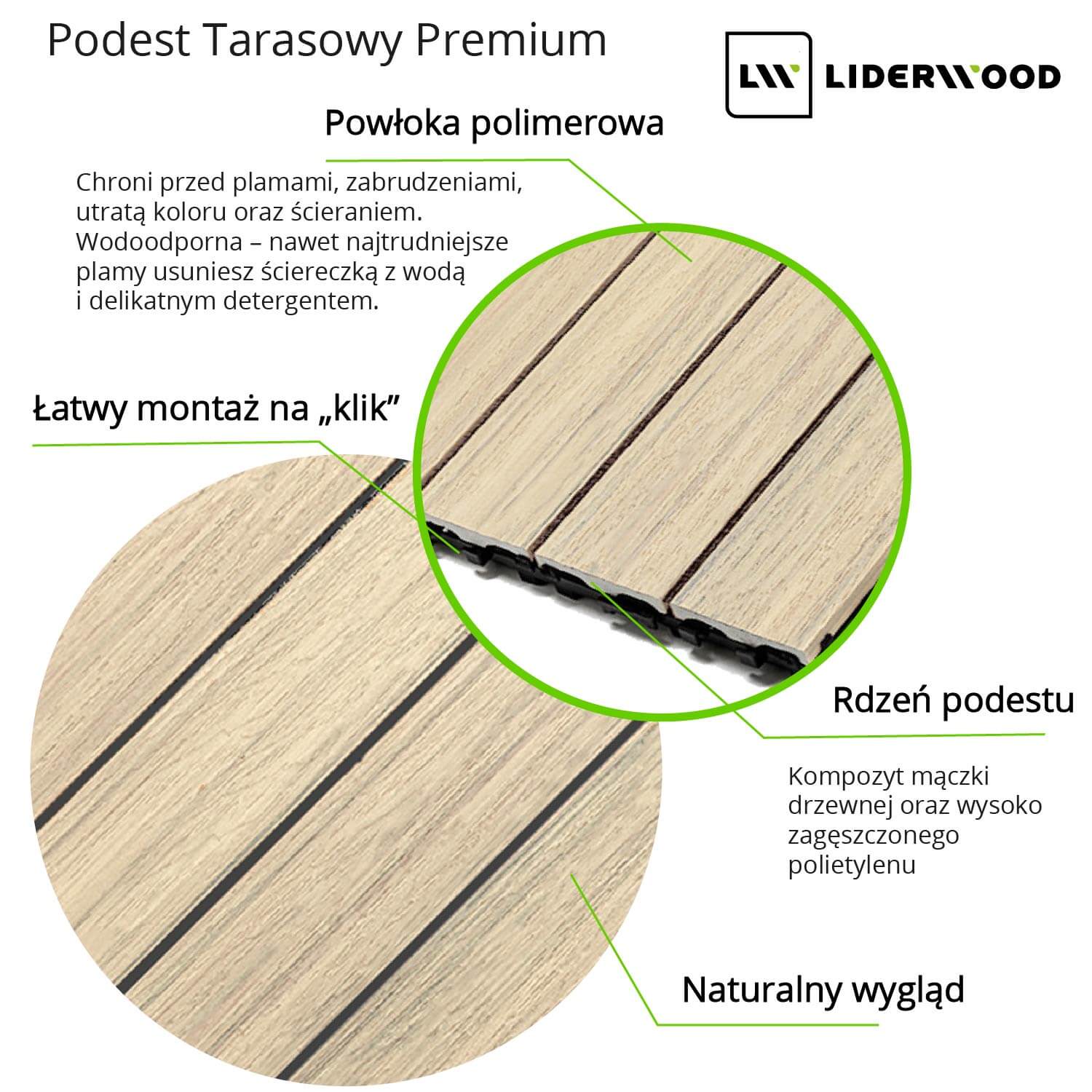 Podesty kompozytowe Premium II generacji wyróżniają się wyjątkową jakością wykonania. Nie tylko naturalnie wyglądają jak drewno, ale są również solidne i trwałe. Powierzchnia z ochronną warstwą polimerową zabezpiecza podesty przed zabrudzeniami, plamami i ścieraniem. Nie musisz ich impregnować co roku – wystarczy standardowa pielęgnacja i utrzymanie ich w czystości.