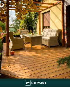 Szczególną uwagę przyciąga donica – jej boki wykonano z lameli Walnut, a górę wykończono deskami Amber, co nadaje konstrukcji wyjątkowego charakteru. Schody z ciepłych desek Amber doskonale uzupełniają kompozycję, a kontrastowe połączenie kolorów podkreśla oryginalność całej realizacji.