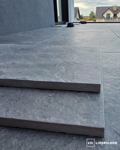 Wyjątkowa aranżacja wejścia do domu łączy ciepłe odcienie desek tarasowych Premium Amber ze strukturą lameli 3D Premium Walnut. Taras i schody z desek Amber harmonijnie współgrają z ciemniejszymi lamelami elewacyjnymi, tworząc nietuzinkowy i elegancki efekt.