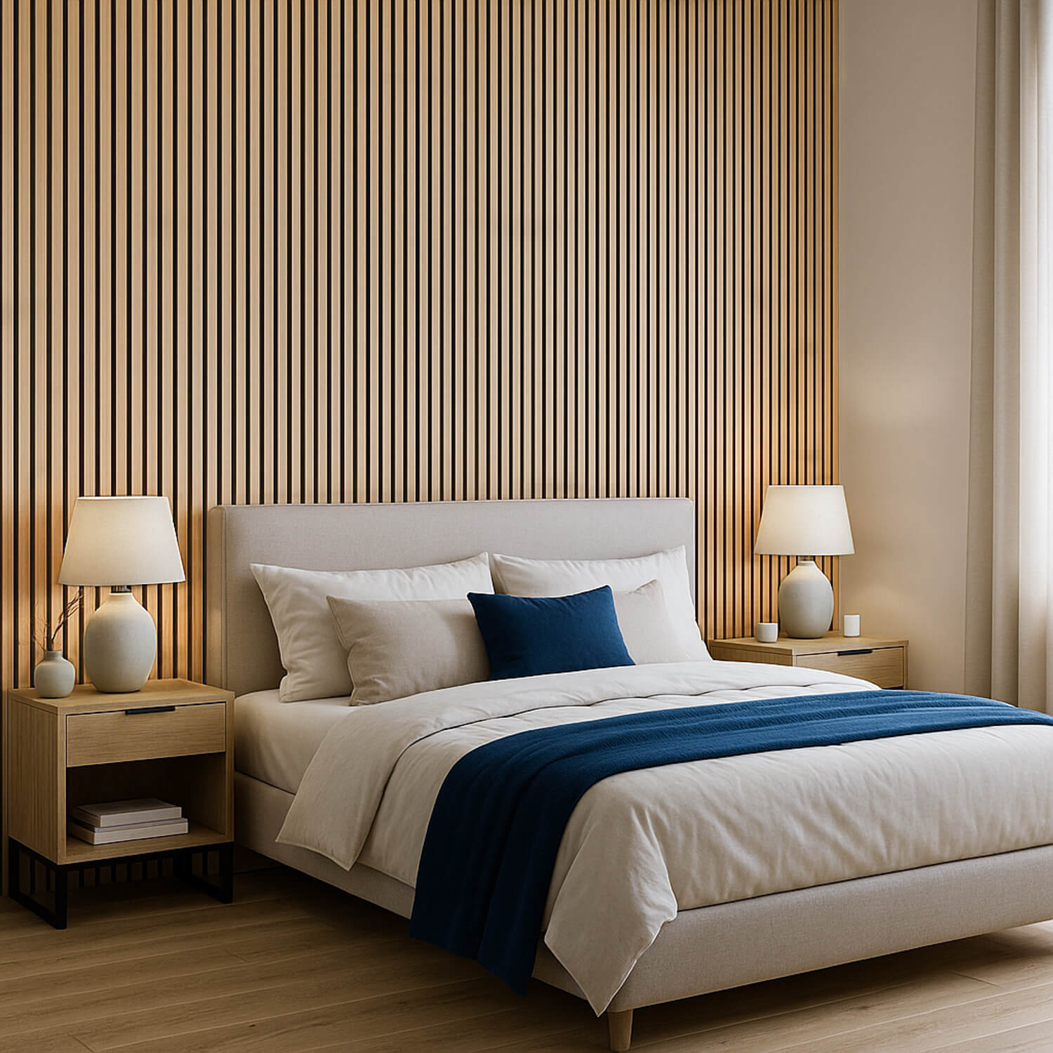Panele lamelowe akustyczne na czarnym filcu doskonale komponują się z każdą przestrzenią wewnętrzną – niezależnie od tego, czy jest to sypialnia, kuchnia, lokale użytku publicznego, czy też przestrzeń biznesowa. Ich uniwersalność pozwala na wykorzystanie ich zarówno jako efektownego zagłówka łóżka, eleganckiej ścianki telewizyjnej, jak i inspirującej dekoracji ściennej lub sufitowej w miejscu pracy lub odpoczynku. Wykończenie przestrzeni lamelami nie tylko nadaje jej wyjątkowy charakter, ale również jest praktyczne – panele są wytrzymałe, łatwe w montażu i utrzymaniu, a także nie wymagają konserwacji ani impregnacji. Można nimi ozdobić całą ścianę lub jej fragment, tworząc przestrzeń o niepowtarzalnym designie i akustyce.