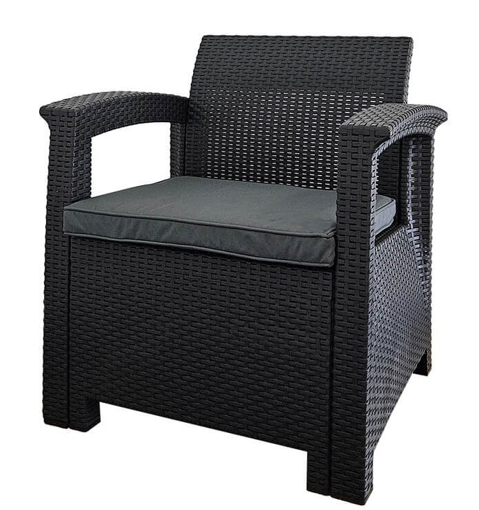 Dwa wygodne fotele i dwuosobowa sofa razem ze stolikiem tworzą praktyczny i wygodny 4-osobowy zestaw mebli ogrodowych.
