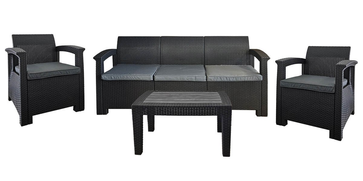 Dwa wygodne fotele i dwuosobowa sofa razem ze stolikiem tworzą praktyczny i wygodny 4-osobowy zestaw mebli ogrodowych.